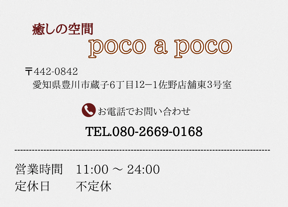 poco a poco(ポコ ア ポコ)とは、イタリア語で「焦らず・ゆっくり」という意味を持ちます。このストレス社会において心身不調の方が増えている中、1人でも多くのお客様が癒されて心身ともに元気に過ごして頂ける施術やセラピーを提供していきたいという思いを込めて考えました。