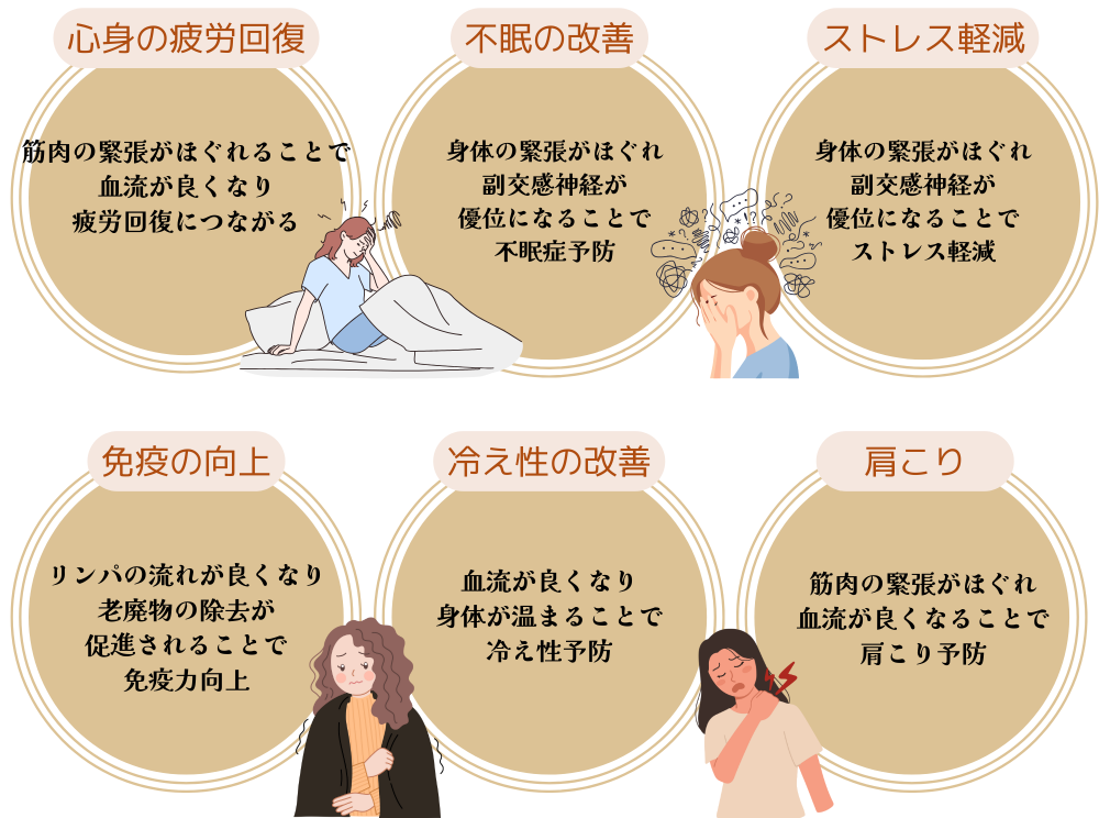 肉体的な疲労の改善だけでなく、精神的ストレスの緩和にも効果があると言われています。